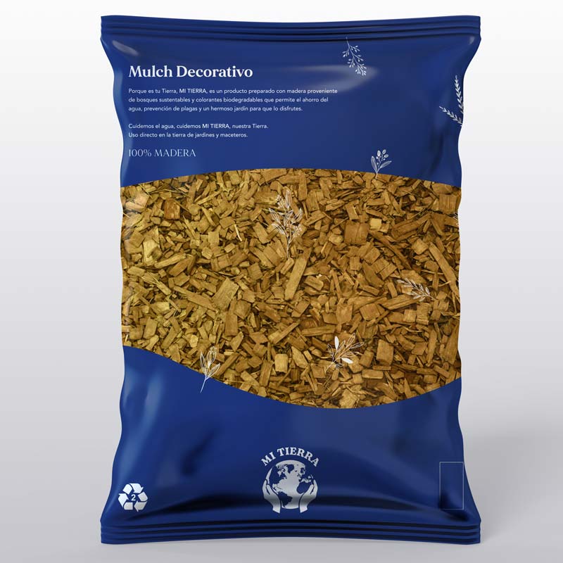 Mulch “Mi Tierra” en color amarillo, es un producto que fomenta la belleza de tu patio y jardín. Consta de “chips” o astillas de madera de pino teñidas con pigmentos naturales inocuos y nutritivos para tus plantas. Solo debes aplicarlo y distribuir de manera uniforme sobre la superficie de tu jardín idealmente alrededor de plantas o árboles ya que retiene la humedad y previene la formación de malezas.