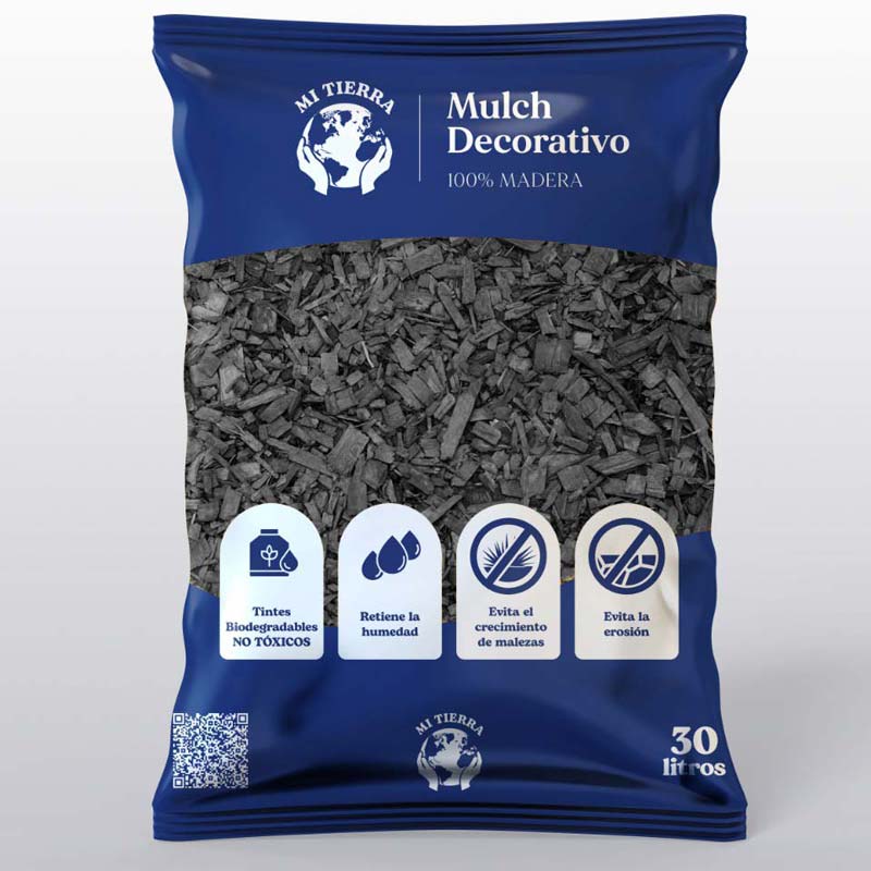 Mulch “Mi Tierra” en color negro, es un producto que fomenta la belleza de tu patio y jardín. Consta de “chips” o astillas de madera de pino teñidas con pigmentos naturales inocuos y nutritivos para tus plantas. Solo debes aplicarlo y distribuir de manera uniforme sobre la superficie de tu jardín idealmente alrededor de plantas o árboles ya que retiene la humedad y previene la formación de malezas.